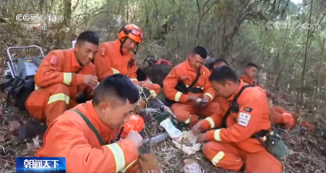 在林子裏穿梭6個(ge) 小時後,隊員們(men) 在半山腰的叢(cong) 林裏,開始一天的“正餐”,這也是他們(men) 一天中難得的休閑時光。