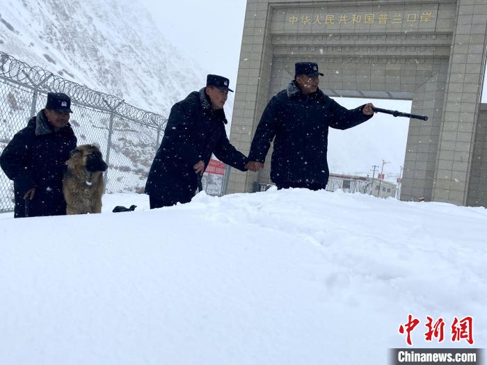圖為(wei) 在積雪中守衛國門的普蘭(lan) 邊檢站民警。 普蘭(lan) 邊檢站供圖
