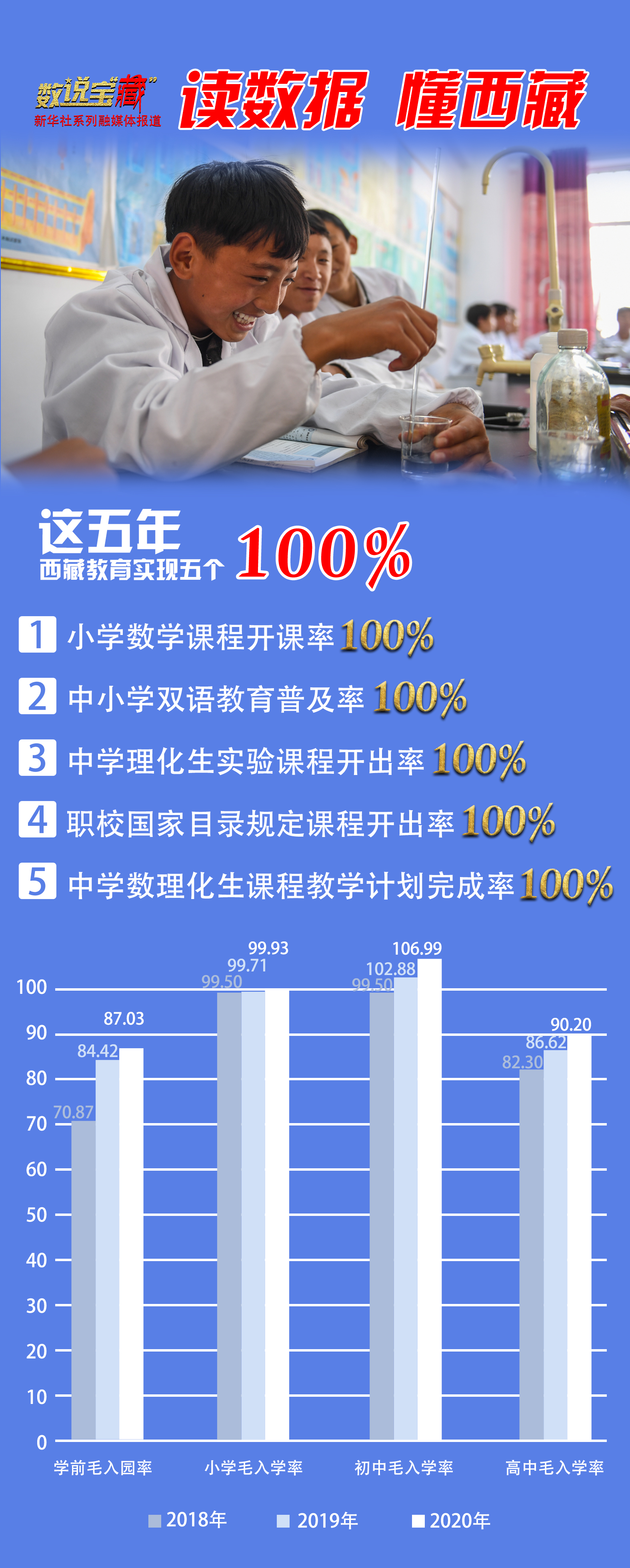 西藏自治區教育廳公布的數據顯示:“十三五”時期,西藏教育“五個(ge) 100%”全麵實現,即中小學雙語教育普及率100%,小學數學課程開課率100%,中學數理化生課程教學計劃完成率100%,中學理化生實驗課程開出率100%,職業(ye) 技術學校國家目錄規定課程開出率100%。