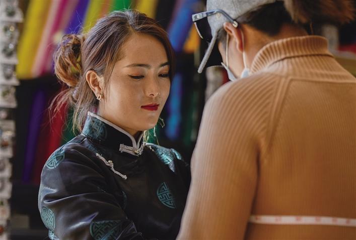 “老板,你家還有這款藏裝嗎?我想要一款。”在該店內(nei) ,市民卓嘎拿出手機,指著格桑措姆錄製的藏裝短視頻說道。“有的,這是我們(men) 今年推出的新款,是對傳(chuan) 統的藏裝進行了改良,主要是體(ti) 現在領口處,改良後的藏裝對領口部位進行了複古簡約化設計,使其兼具美觀性與(yu) 舒適性,再搭配一個(ge) ‘卡烏(wu) ’堪稱完美。”格桑措姆介紹道。