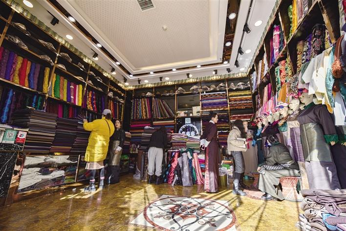 近日,記者來到位於(yu) 神力時代廣場的666時尚藏裝店,剛進店門就被眼前琳琅滿目的布料所吸引,一匹匹布料整齊地擺放在櫥窗裏,讓人目不暇接。店內(nei) 的顧客也在挑選著麵料、款式,而藏裝店的老板也在不停地為(wei) 顧客介紹今年的各類新款,供顧客選擇。