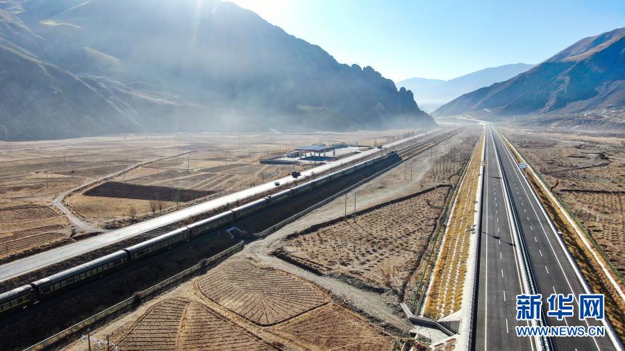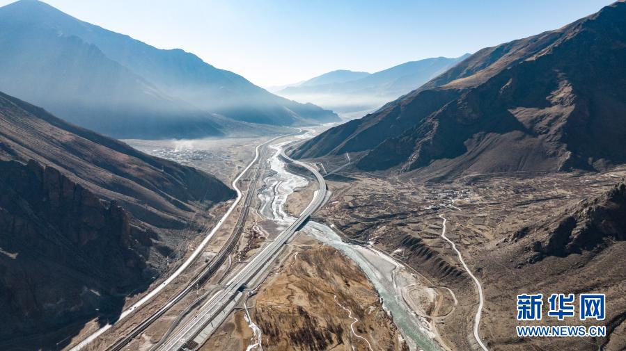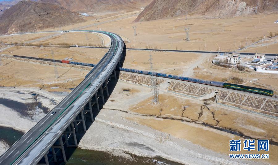這是拉薩至那曲高等級公路和青藏鐵路沿線風光(1月28日攝,無人機照片)。新華社記者 普布紮西 攝