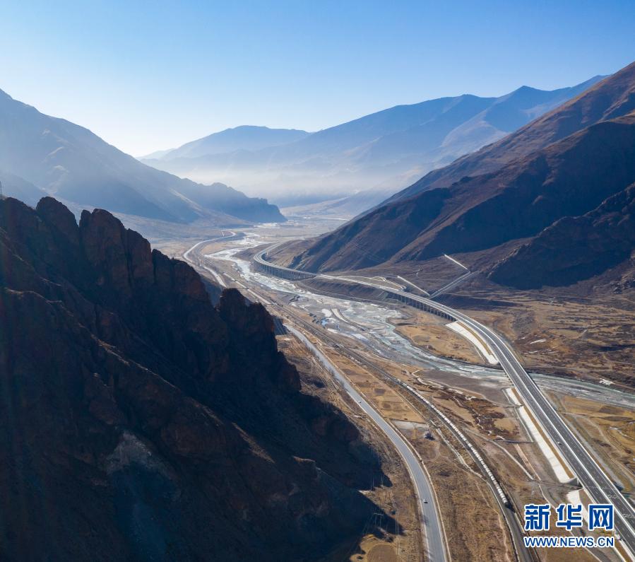 這是拉薩至那曲間的交通線路(1月28日攝,無人機照片)。從(cong) 左到右依次為(wei) 109國道、青藏鐵路、高等級公路、鄉(xiang) 村公路。新華社記者 晉美多吉 攝