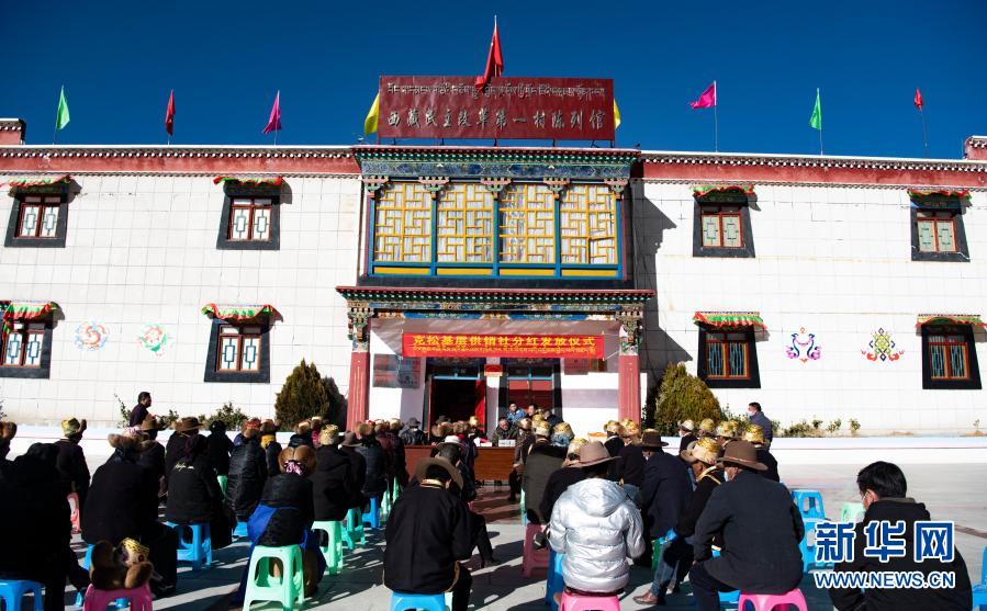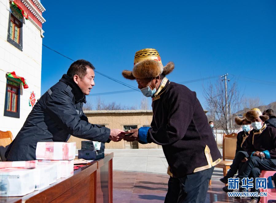 2月9日,西藏自治區供銷合作社社有企業(ye) ——西藏領峰田舍益家公司負責人趙全(左一)給當地群眾(zhong) 發放分紅。新華社記者 普布紮西 攝