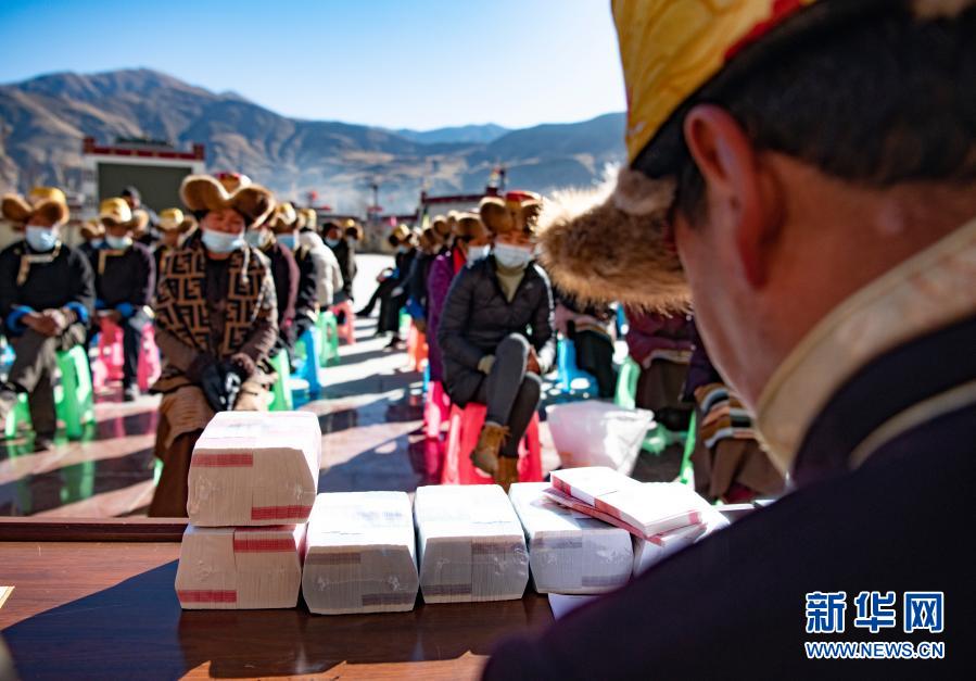 2月9日,在西藏民主改革第一村——山南市乃東(dong) 區克鬆村社區,農(nong) 民依次領取嶄新的百元鈔票,為(wei) 即將到來的藏曆新年增添了喜慶的氛圍。新華社記者 普布紮西 攝