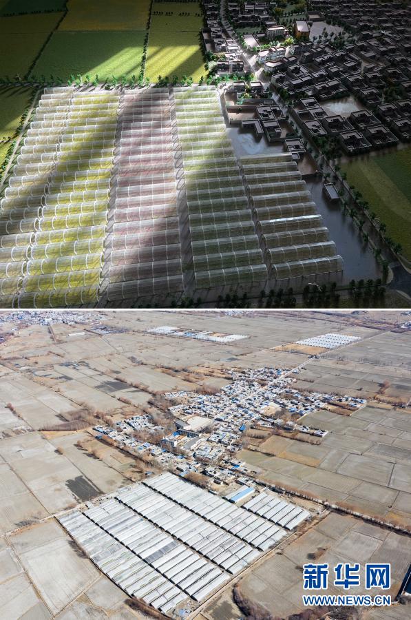 拚版照片:上圖是西藏山南市乃東(dong) 區克鬆村社區農(nong) 業(ye) 產(chan) 業(ye) 生產(chan) 基地規劃圖(2月9日攝);下圖是克鬆村社區農(nong) 業(ye) 產(chan) 業(ye) 生產(chan) 基地(2月9日攝,無人機照片)。新華社記者 普布紮西 攝