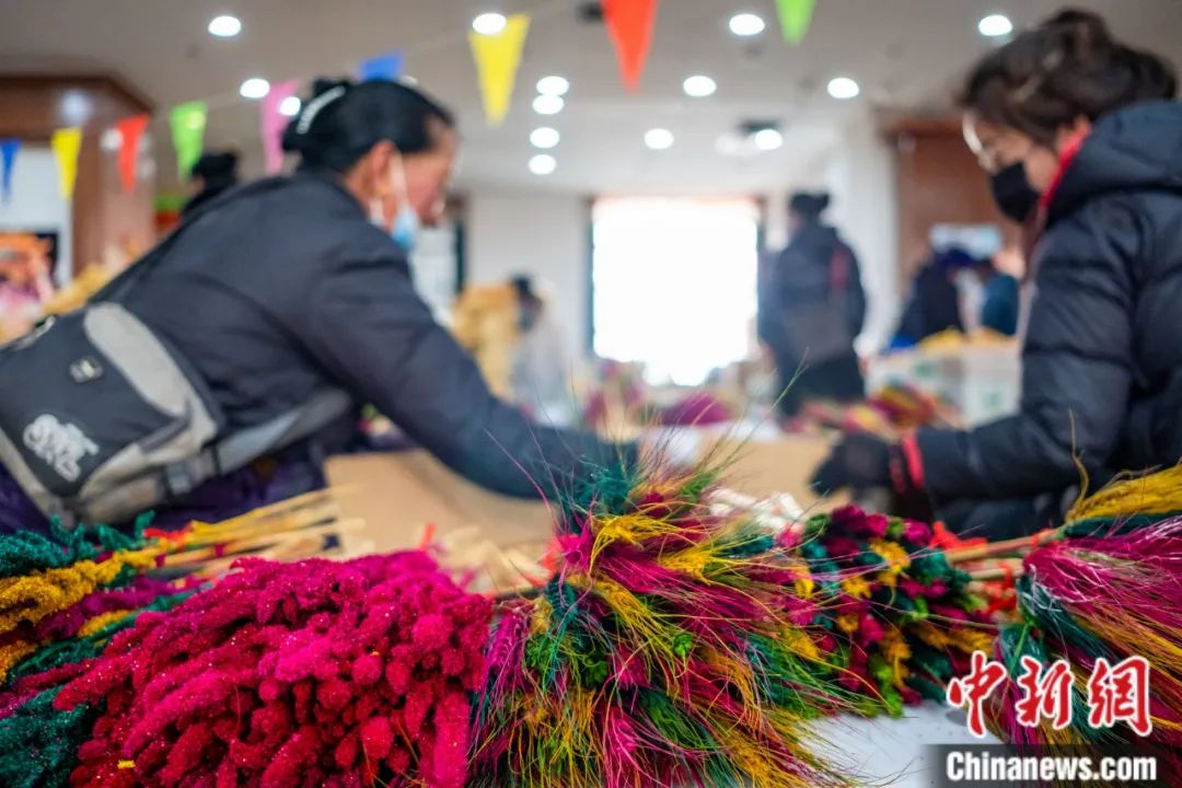 上圖為(wei) 藏年花,藏語稱“羅薩美朵”,藏語中,“羅薩”是藏曆新年,“美朵”是鮮花的意思。插上“羅薩美朵”寓意著來年有一個(ge) 美滿、豐(feng) 收的幸福年。何蓬磊 攝