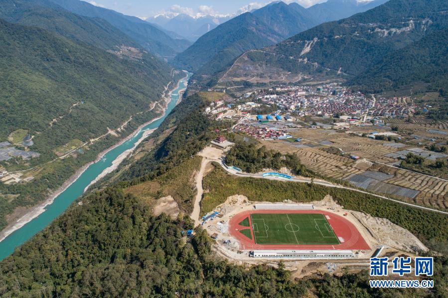這是墨脫縣新修建的11人製足球場(2月13日攝,無人機照片)。新華社記者 羅博 攝