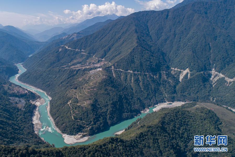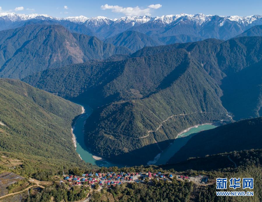 西藏林芝市墨脫縣德興(xing) 鄉(xiang) 巴登則村位於(yu) 雅魯藏布江邊的一座山上(2月9日攝,無人機照片)。新華社記者 孫非 攝