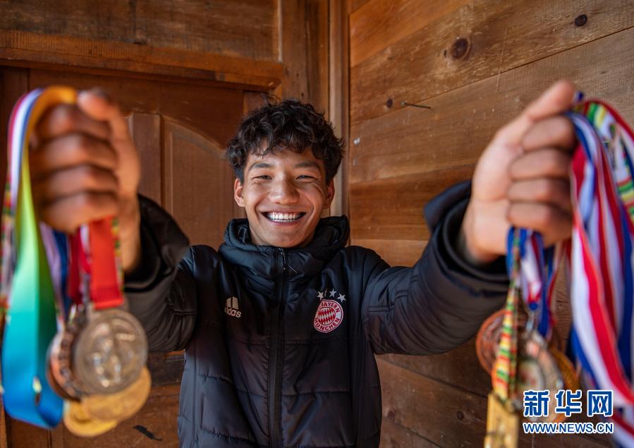 在位於(yu) 西藏林芝市墨脫縣德興(xing) 鄉(xiang) 巴登則村的家中,旺前羅布展示自己獲得的獎牌(2月9日攝)。新華社記者 孫非 攝