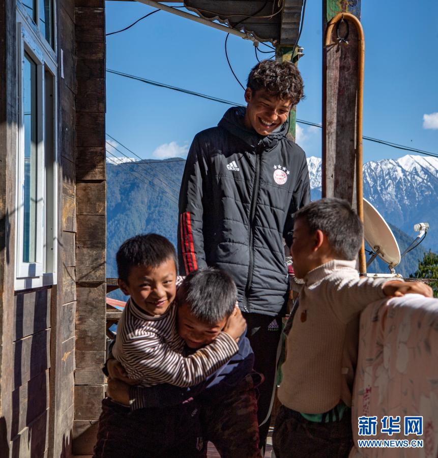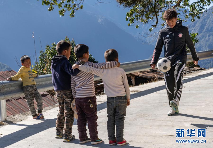 在西藏林芝市墨脫縣德興(xing) 鄉(xiang) 巴登則村,旺前羅布向弟弟們(men) 展示自己的球技(2月9日攝)。新華社記者 孫非 攝