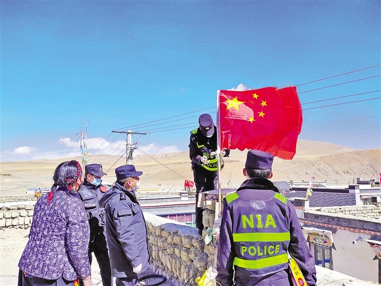 圖為(wei) 崗巴縣移民警察與(yu) 當地群眾(zhong) 一起歡度“雙節”,一起更換屋頂五星紅旗。紮西頓珠 攝