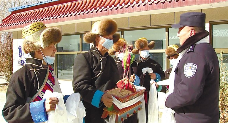 圖為(wei) 康馬縣康馬鎮格龍村群眾(zhong) 和檢查站民警相互拜年。紮西頓珠 攝