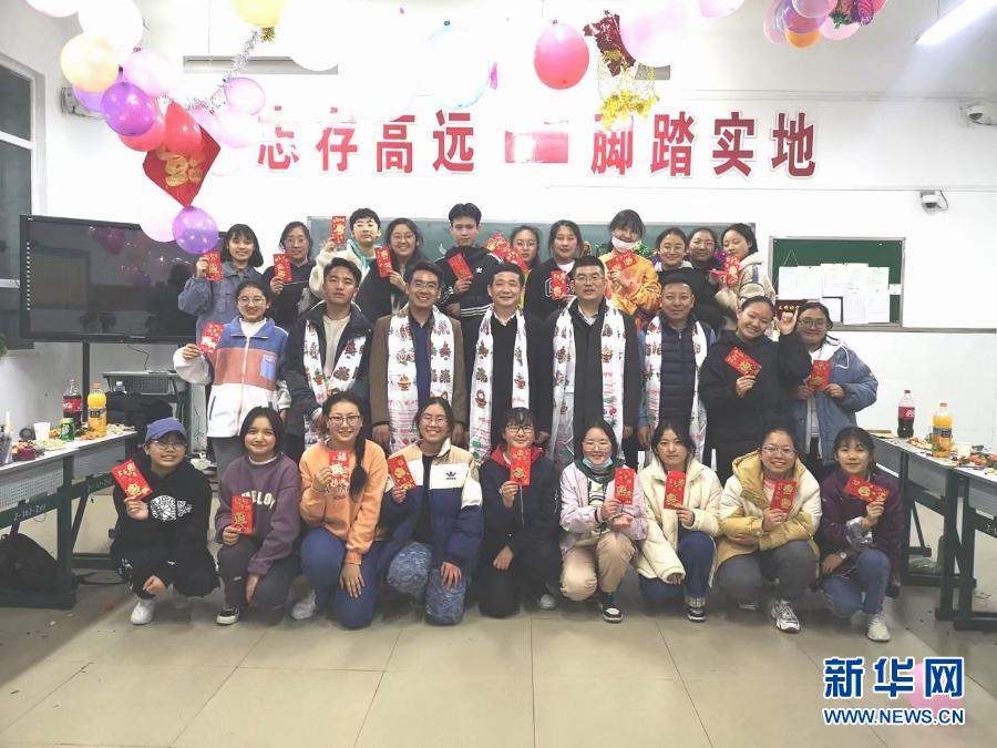 除夕當日,老師們(men) 與(yu) 同學聯歡後合影留念(山大附中提供)。新華網 發