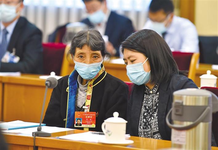 圖為(wei) 為(wei) 協助基層全國人大代表更全麵地了解會(hui) 議內(nei) 容,十三屆全國人大四次會(hui) 議西藏代表團專(zhuan) 門配備了翻譯人員。圖為(wei) 西藏全國人大代表卓嘎通過翻譯人員了解其他代表的發言內(nei) 容。旦增西旦 攝