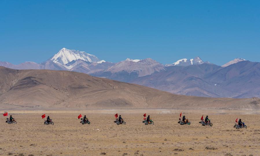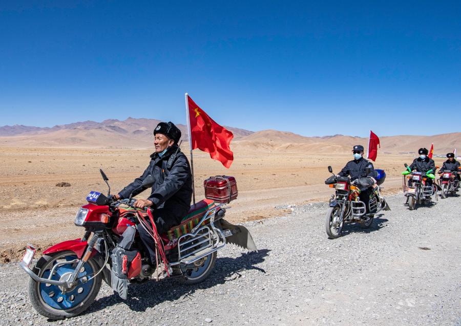 西藏日喀則市薩嘎縣昌果鄉(xiang) 的一處村莊裏,48歲的藏族漢子石覺塔布在風中跨上一輛摩托車,向平坦無垠的高原邊緣騎去。他的車尾插著一麵五星紅旗,被風吹得獵獵作響,即便駛出很遠,那抹紅色在車輪卷起的煙塵中也依然醒目。