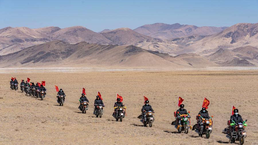 和高原的許多牧民一樣,石覺塔布是個(ge) “騎士”。從(cong) 前,他騎馬放牧;現在,他騎摩托車守邊。作為(wei) 昌果邊境派出所摩托車巡邏隊的隊長,這天,他要帶隊進行邊境巡防訓練。