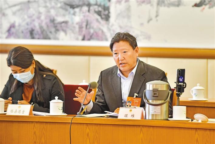 圖為(wei) 全國人大代表旺堆在十三屆全國人大四次會(hui) 議西藏代表團全體(ti) 會(hui) 議上發言。記者 旦增西旦 攝