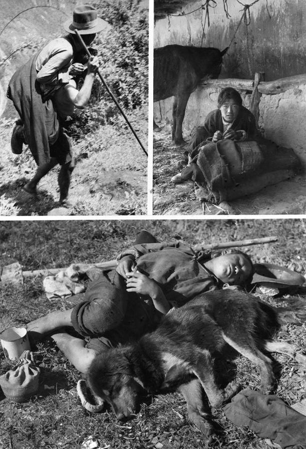 上圖左:西藏農(nong) 奴製度下的“人背人”(即農(nong) 奴像牲畜一樣背馱著農(nong) 奴主)差役。上圖右:和牲口同住的農(nong) 奴。下圖:農(nong) 奴益西欽沛服勞役後與(yu) 犬同眠。(新華社發)