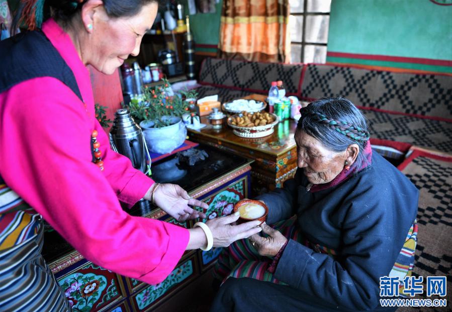 女兒(er) 給巴桑獻酥油茶(2月27日攝)。新華社記者 孫非 攝