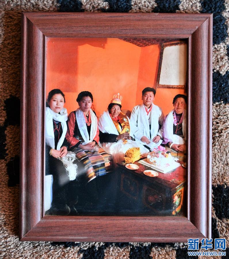 這是家裏懸掛的巴桑老人過生日的照片(2月27日攝)。新華社記者 孫非 攝