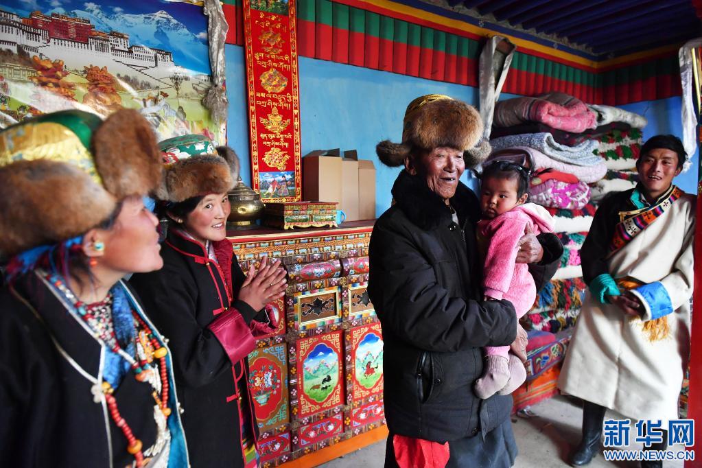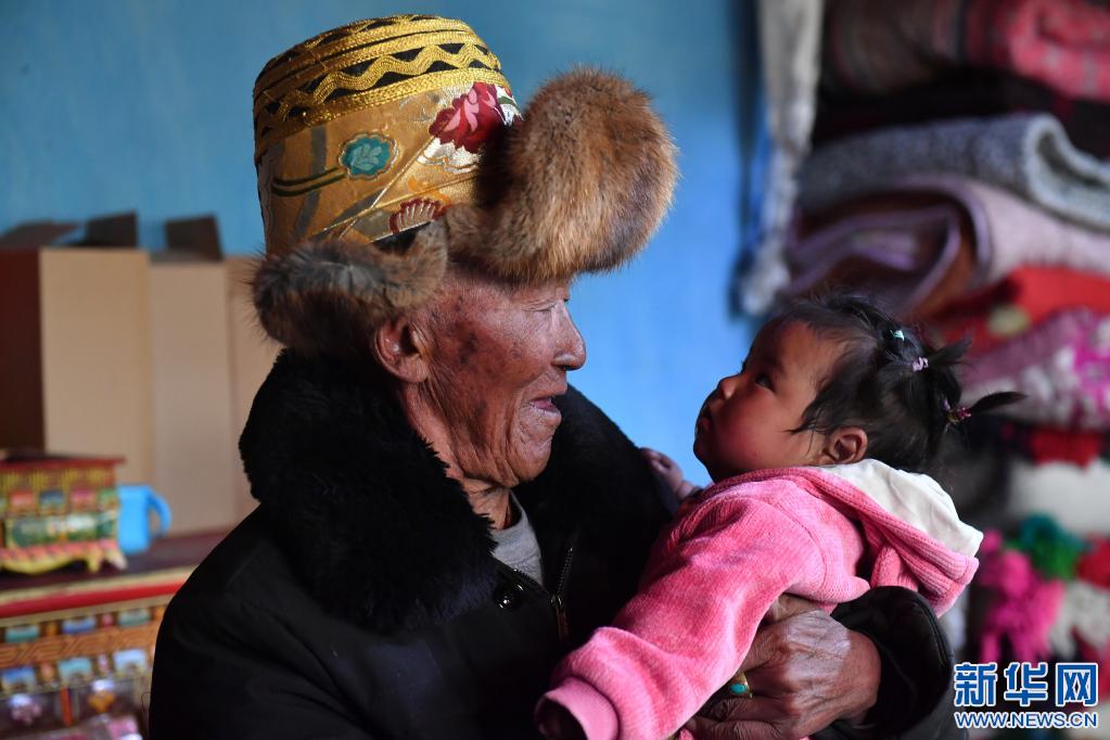 巴桑和九個(ge) 月大的重外孫女白瑪色珍在一起(3月21日攝)。新華社記者 孫瑞博 攝