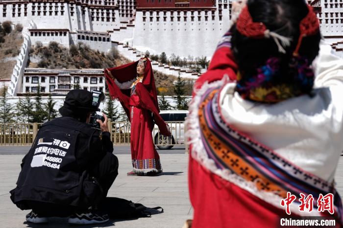 遊客在拉薩布達拉宮廣場體(ti) 驗藏式元素服裝。江飛波 攝