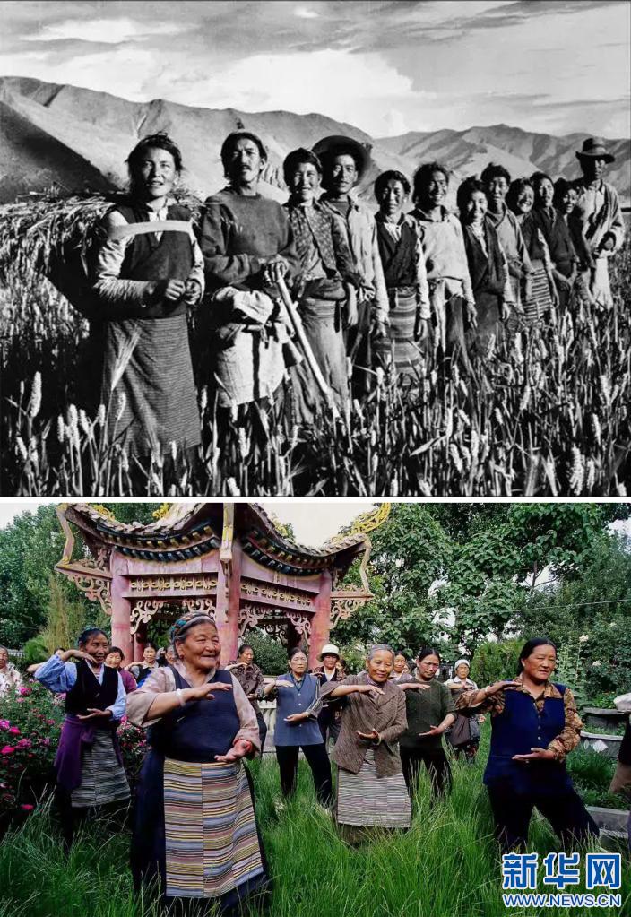 拚版照片:上圖:次仁拉姆(左一)和互助組成員在田間勞作(資料照片)。下圖:次仁拉姆(左前)在社區居委會(hui) 裏學習(xi) 太極拳(新華社發 車剛 攝)新華社發