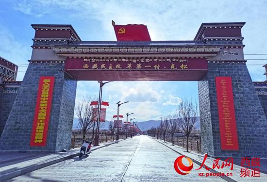 克鬆社區,距拉薩兩(liang) 小時車程。遠遠地,人們(men) 就能看見村口的“西藏民主改革第一村·克鬆”幾個(ge) 大字在陽光下熠熠生輝。