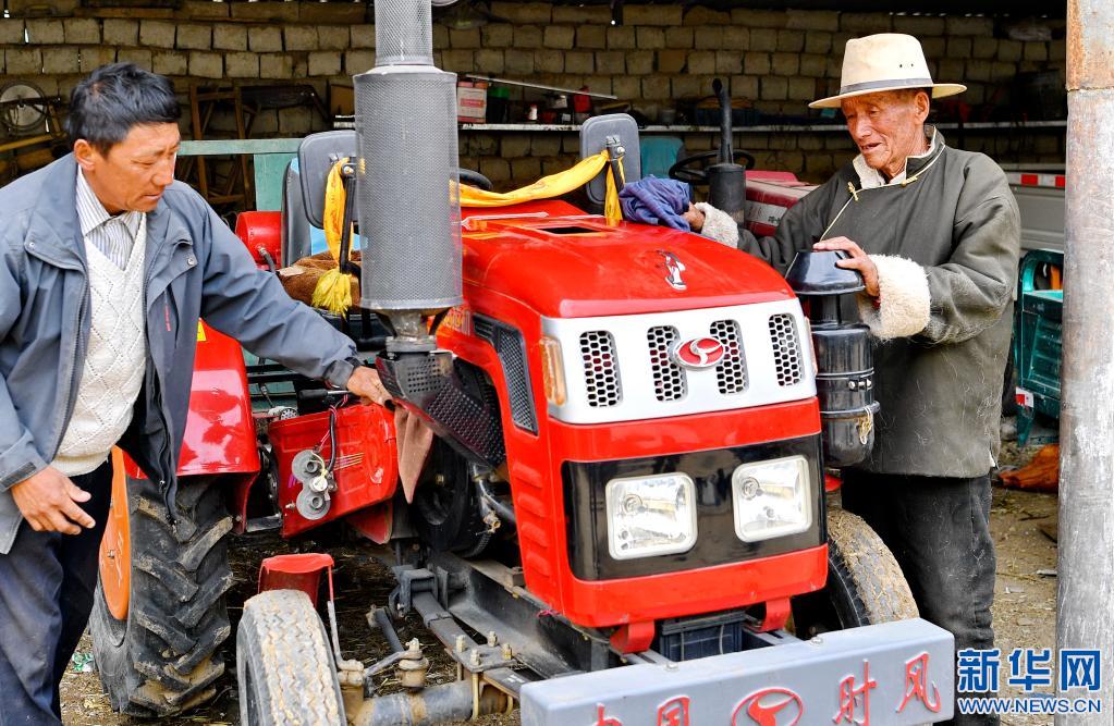 多紮木(右)在擦拭自家的拖拉機(3月20日攝)。新華社記者 張汝鋒 攝
