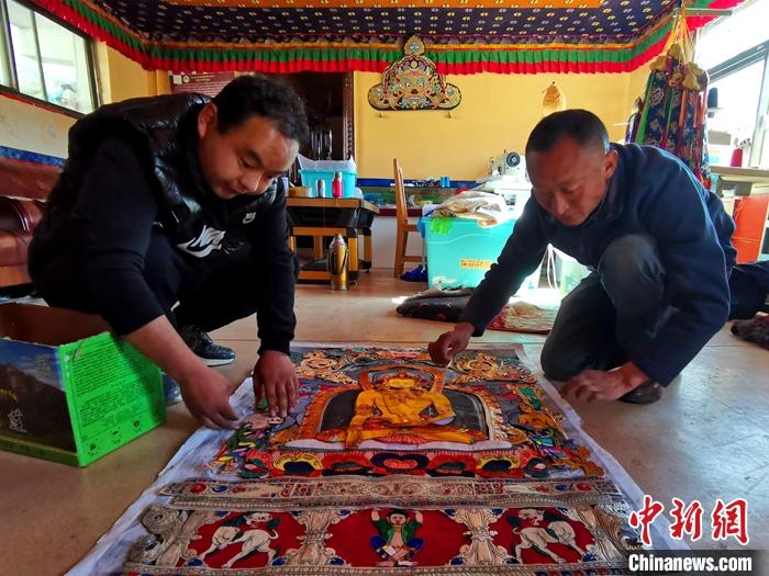 4月5日,拉薩堆繡唐卡技藝傳(chuan) 承人羅布(右)正在和學生共同完成一幅新的堆繡唐卡。中新社記者 趙延 攝