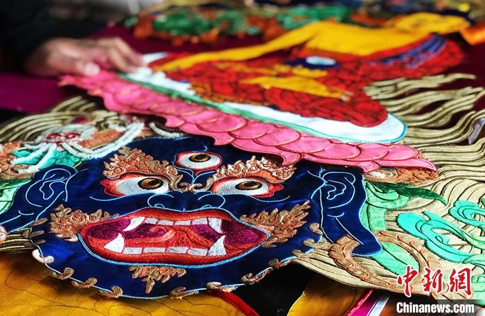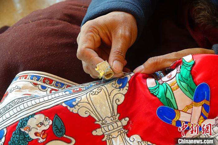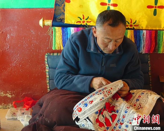 4月5日,拉薩堆繡唐卡技藝傳(chuan) 承人羅布正在進行創作。中新社記者 冉文娟 攝