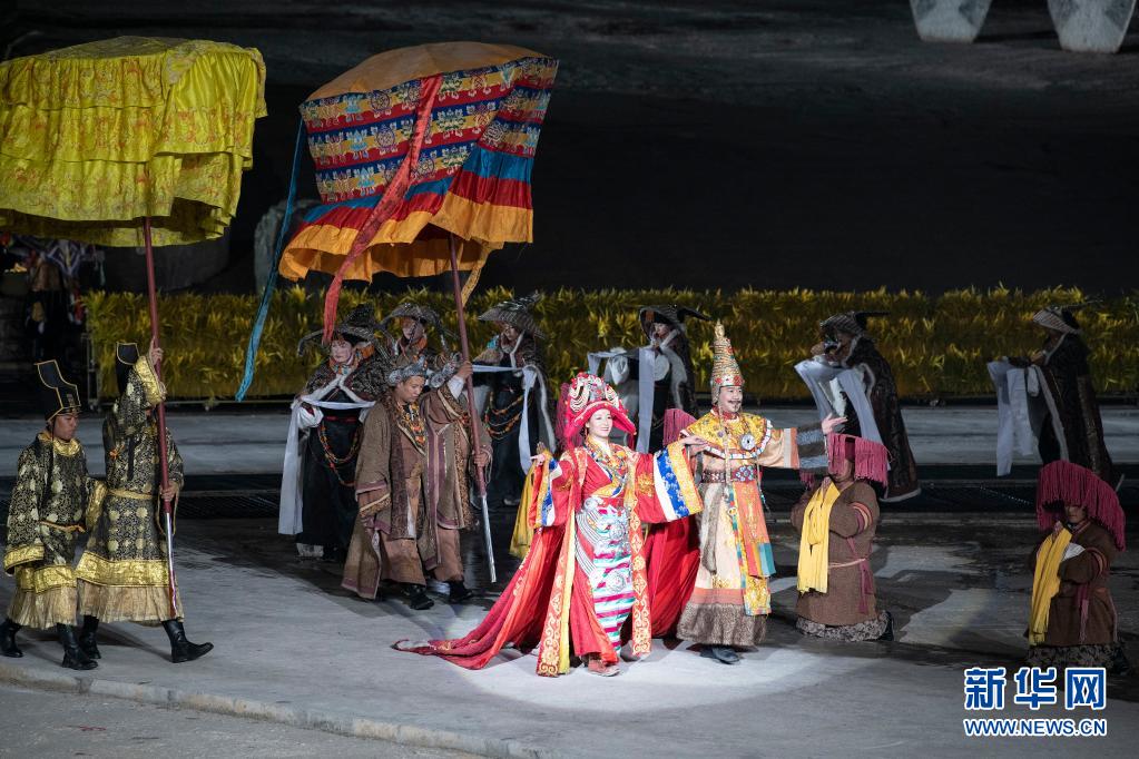 4月10日,演員在大型實景劇《文成公主》中演繹文成公主與(yu) 鬆讚幹布舉(ju) 行婚禮的場景。新華社 孫瑞博 攝
