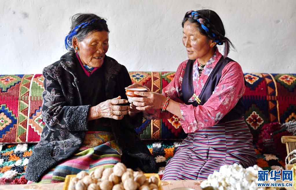 女兒(er) 尼瑪倉(cang) 木決(jue) 給阿媽拉巴(左)敬酥油茶(3月20日攝)。新華社記者 張汝鋒 攝