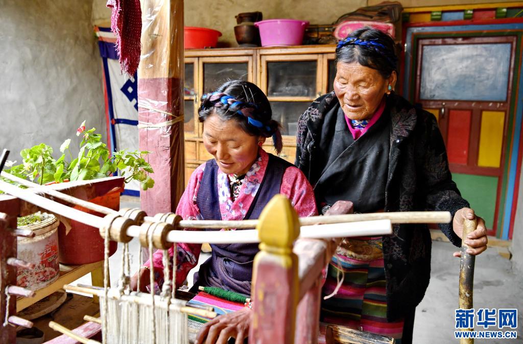 拉巴(右)指導女兒(er) 尼瑪倉(cang) 木決(jue) 織氆氌(3月20日攝)。新華社記者 張汝鋒 攝