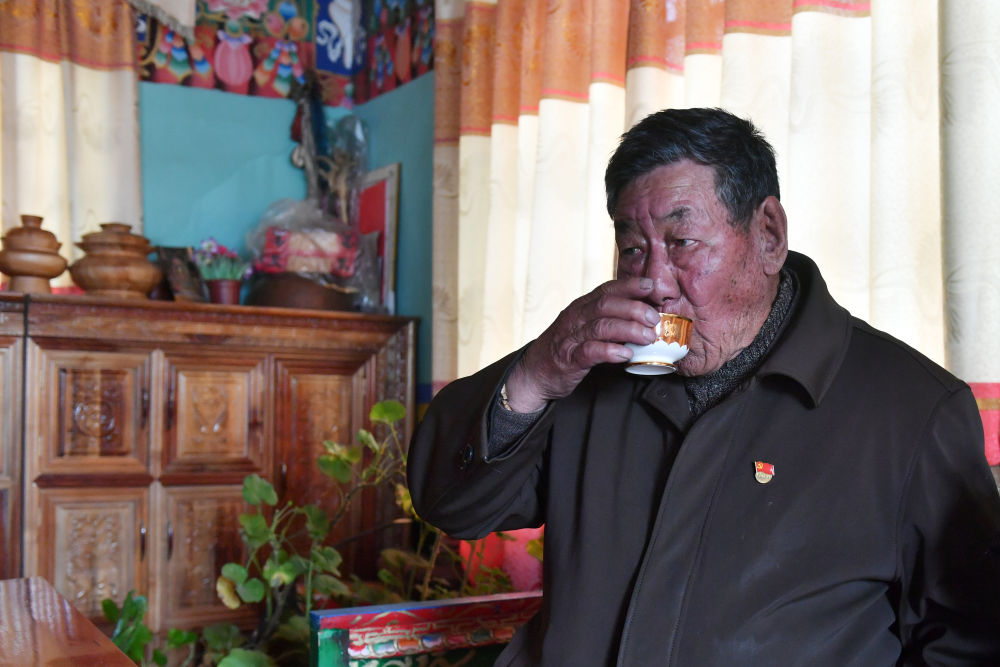 索朗楊佩在位於(yu) 米林縣單嘎努覺村的家裏喝酥油茶(3月30日攝)。