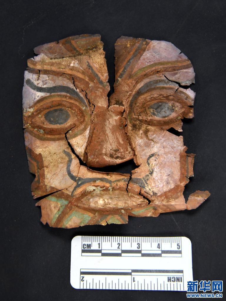 西藏劄達桑達隆果墓地出土的銀質鎏金麵飾。(資料照片)新華社發