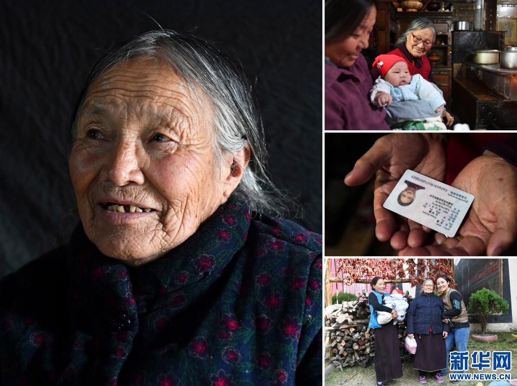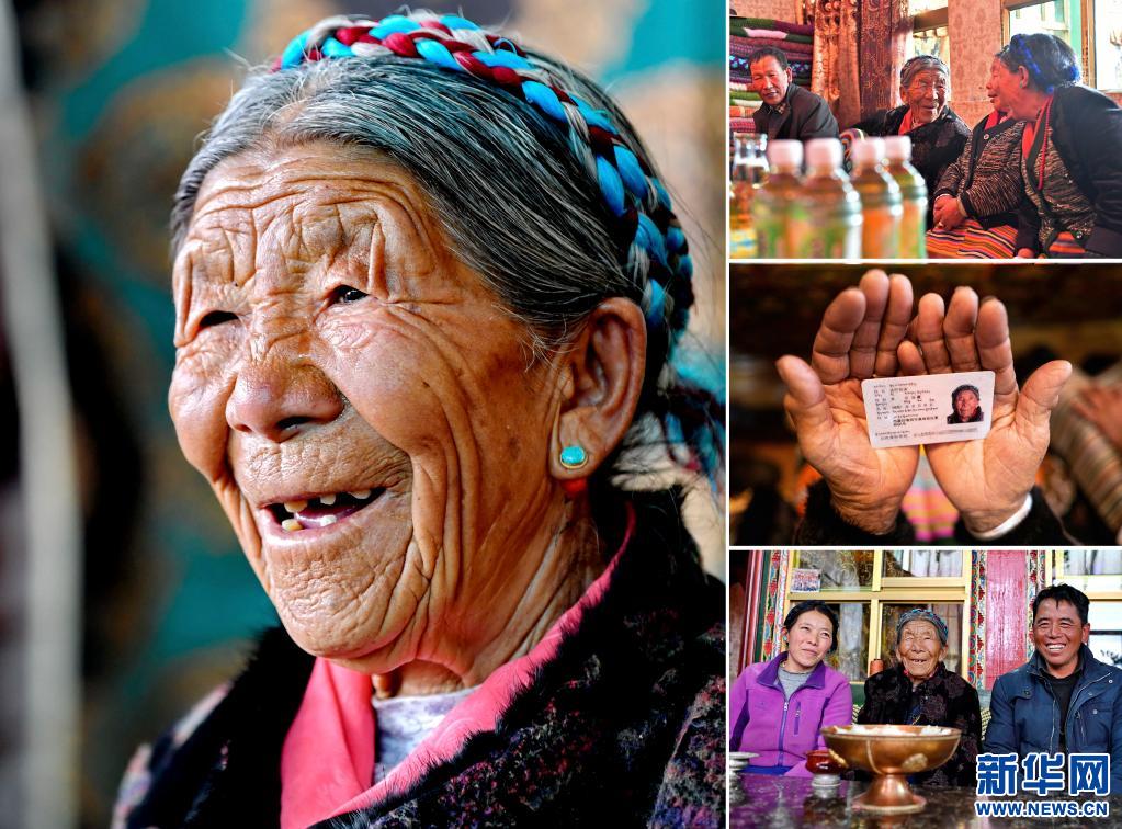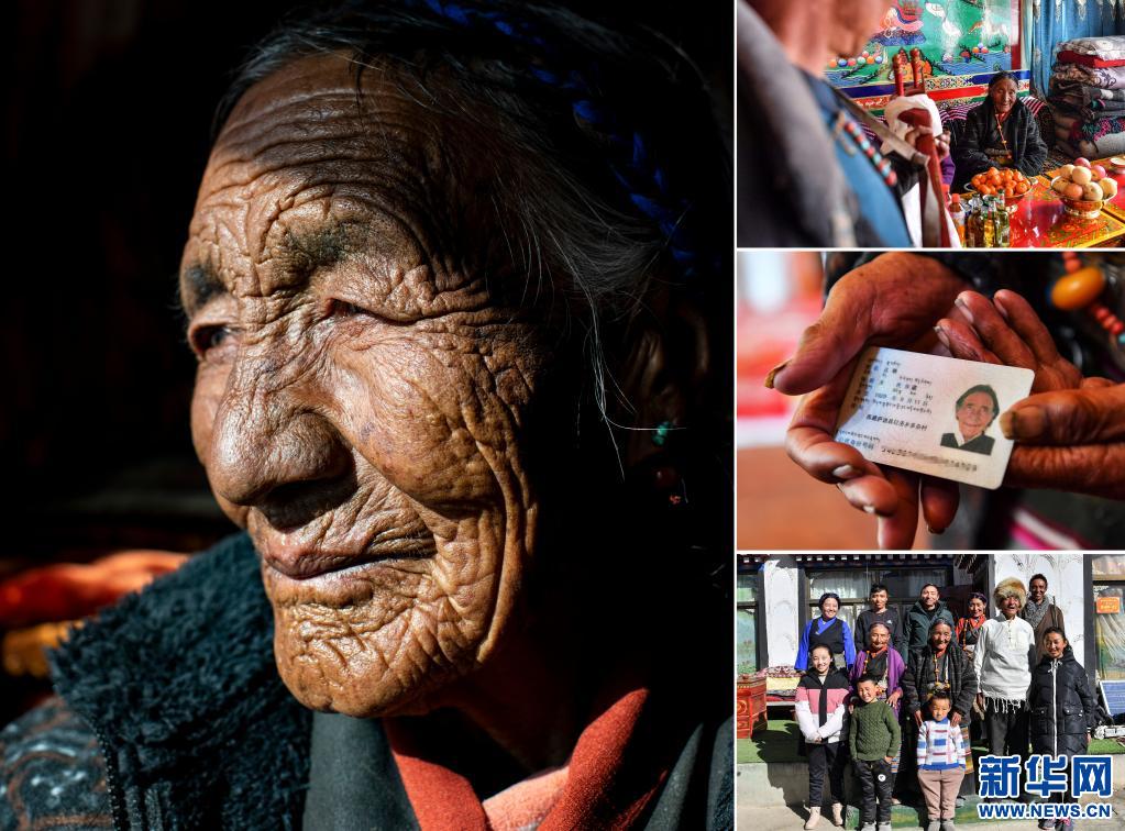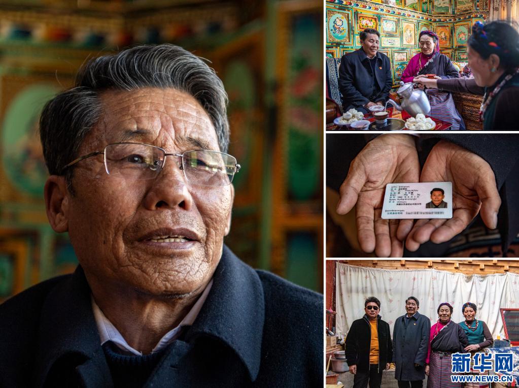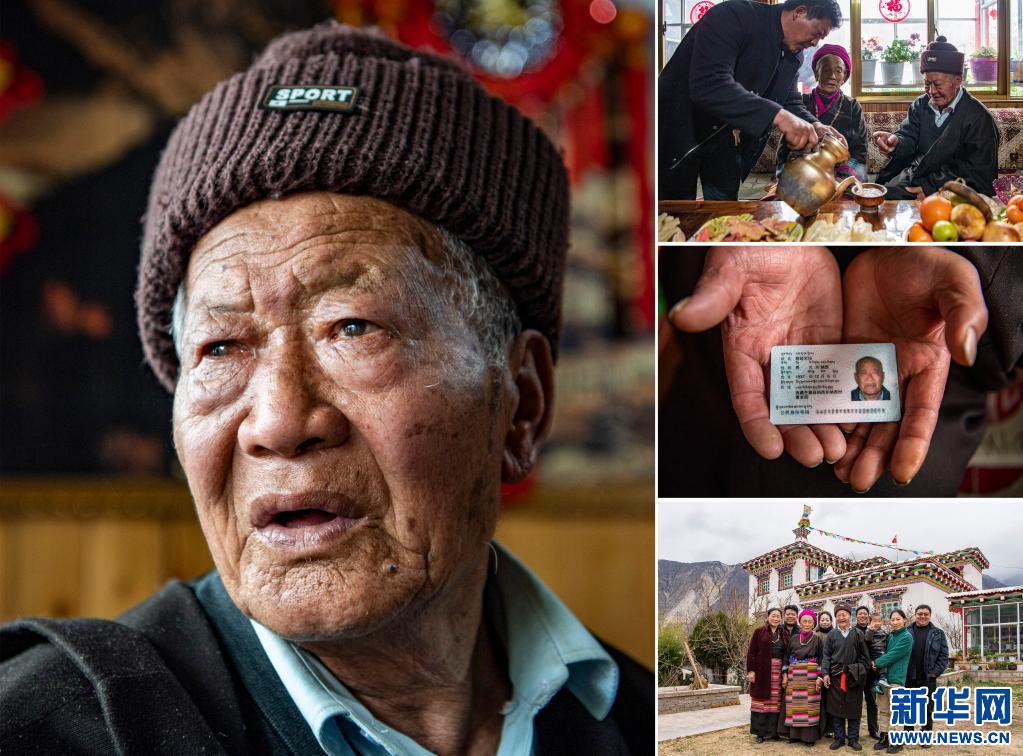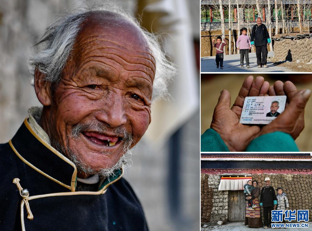 這是一張拚版照片,左圖為(wei) 達確的肖像(1月14日新華社記者普布紮西攝);右上圖為(wei) 家人給達確老人唱歌敬酒(1月14日新華社記者普布紮西攝);右中圖為(wei) 達確的身份證(1月14日新華社記者晉美多吉攝);右下圖為(wei) 達確(中)一家人的合影(1月14日新華社記者晉美多吉攝)。新華社發