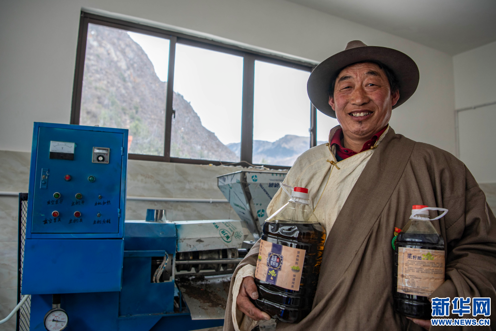 在位於(yu) 昌都市江達縣崗托鎮崗托村的清油加工廠,永紅正在展示清油產(chan) 品(3月23日攝)。新華社記者孫非 攝