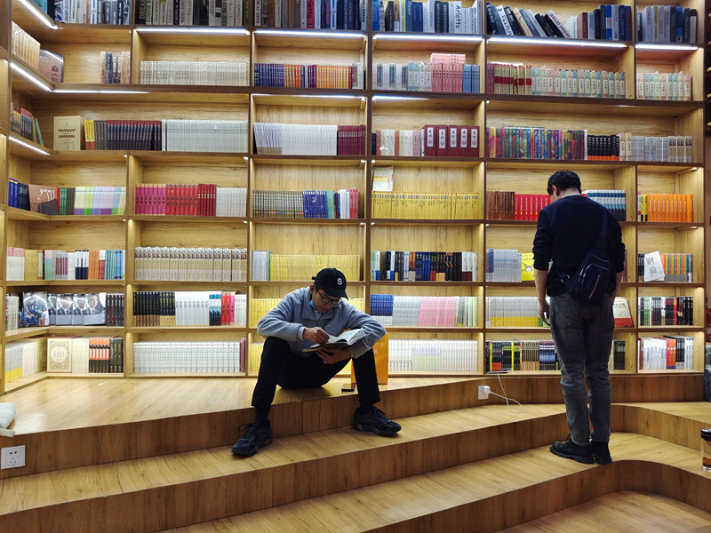傍晚7點,在萬(wan) 達廣場的“央喜書(shu) 吧”裏,與(yu) 朋友約好吃飯的市民拉姆趁著朋友還沒到,抽空選購著書(shu) 籍;