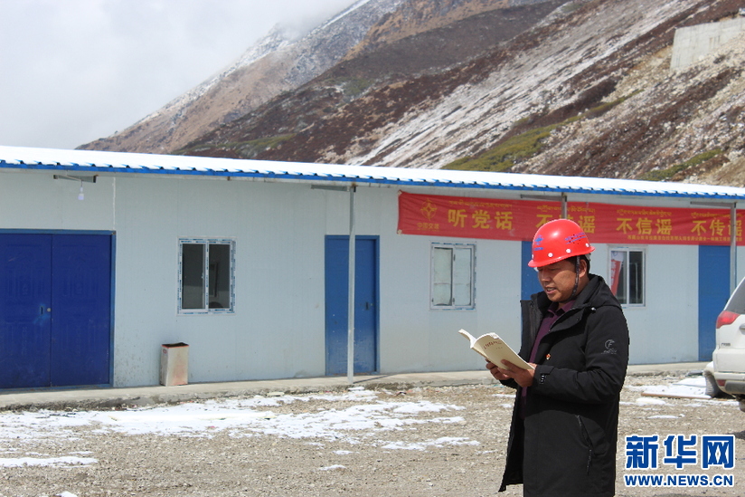 姚紅紀在拉康項目施工點為(wei) 工人講黨(dang) 課(4月24日攝)。新華網發 (王雙雙攝)