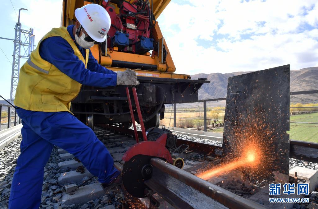 中鐵十一局工人在川藏鐵路拉薩至林芝段進行長鋼軌無縫焊接作業(ye) (2020年4月16日攝)。新華社記者 覺果 攝
