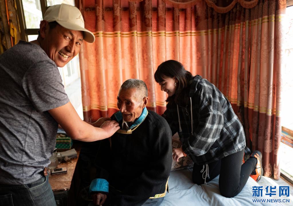 拉布老人的家人幫他整理藏裝(4月25日攝)。新華社記者 普布紮西 攝