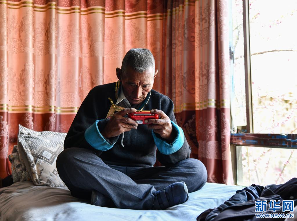 拉布老人在家裏收聽新聞(4月25日攝)。新華社記者 晉美多吉 攝