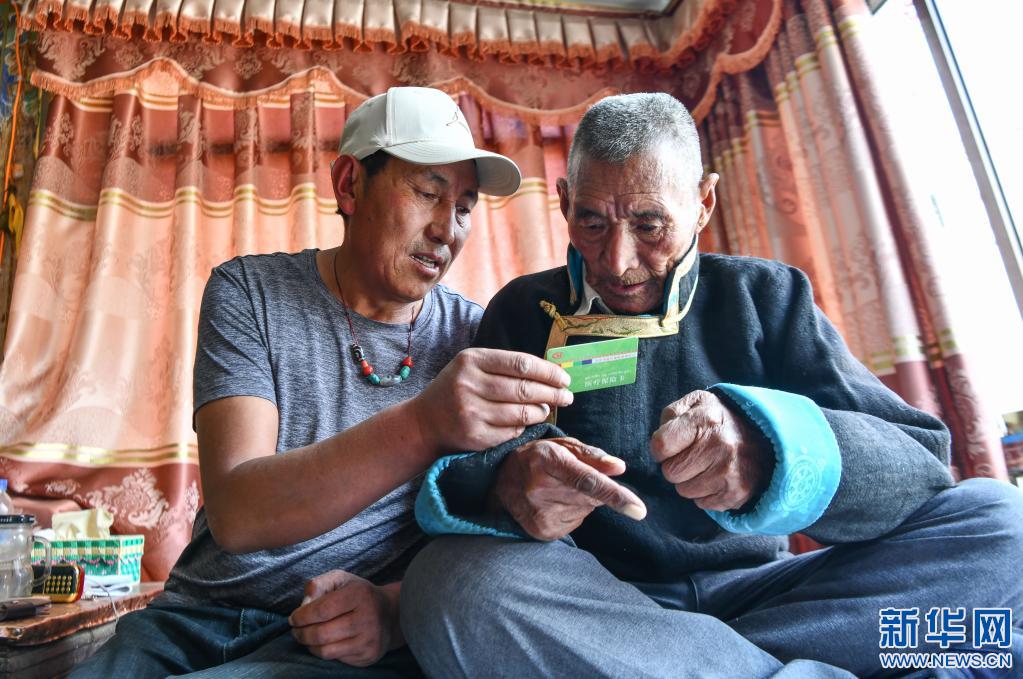 拉布的兒(er) 子(左)在向老人介紹醫保卡的情況(4月25日攝)。新華社記者 晉美多吉 攝