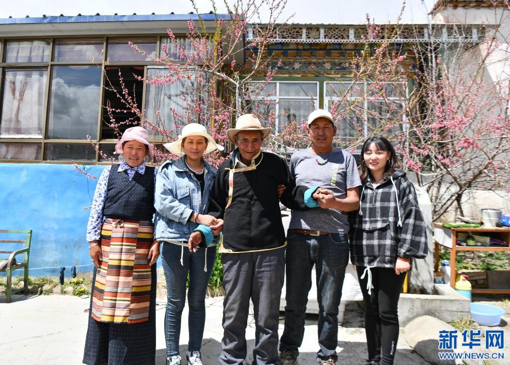 拉布老人(中)在家裏和家人合影(4月25日攝)。新華社記者 晉美多吉 攝