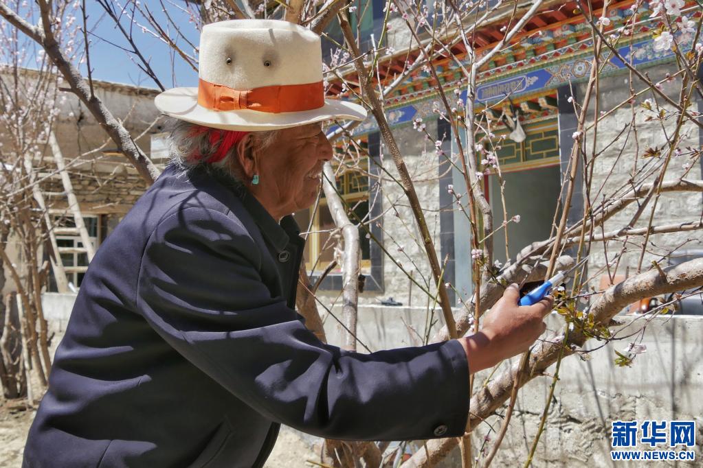 頓珠旺傑在修剪家裏的桃樹樹枝(4月5日攝)。新華社記者 孫陽 攝