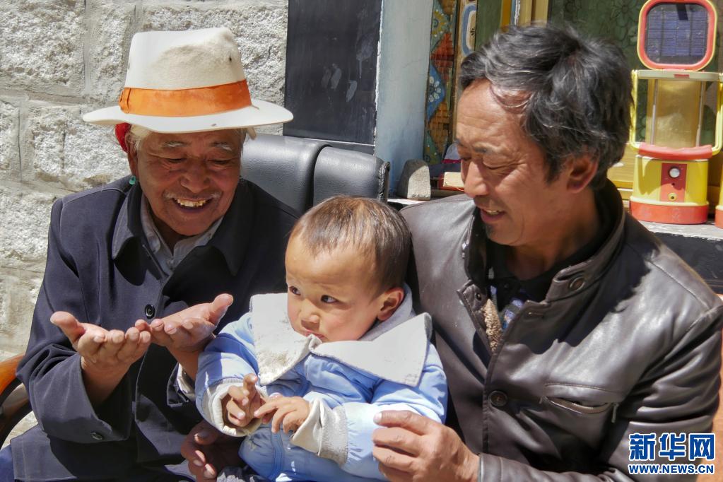 頓珠旺傑(左)和重孫玩耍(4月5日攝)。新華社記者 孫陽 攝