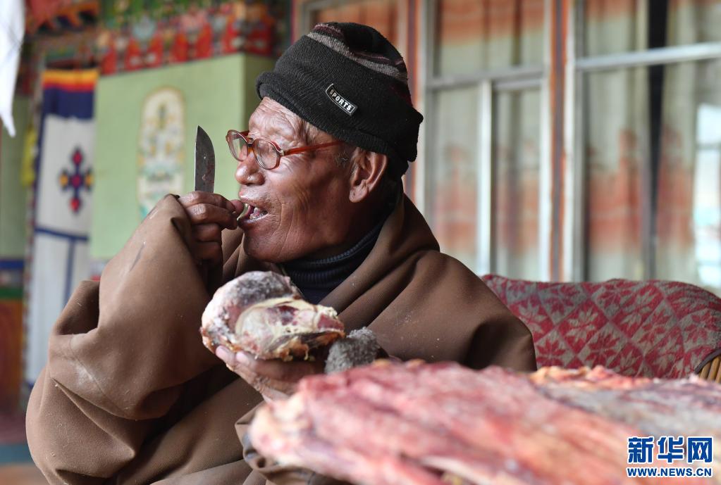 索朗多傑在吃犛牛肉(4月15日攝)。新華社記者 孫瑞博 攝