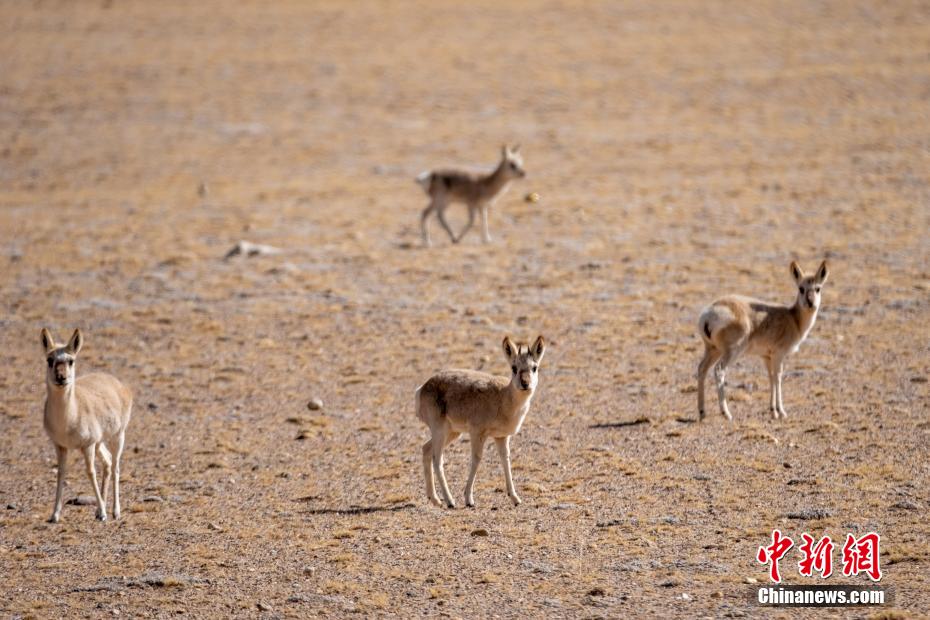 “五一”小長假,中新網記者沿省幹線公路自駕西藏自治區那曲羌塘草原腹地雙湖縣、申紮縣及班戈縣等地,看到當地藏羚羊、藏野驢、藏原羚等成群覓食。羌塘草原平均海拔4500多米,對人類而言氣候條件惡劣,但動物們(men) 卻將此作為(wei) “天堂”。圖為(wei) 5月3日,西藏班戈縣草原上的4隻藏原羚,當地牧民稱為(wei) 黃羊。江飛波 攝